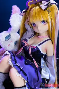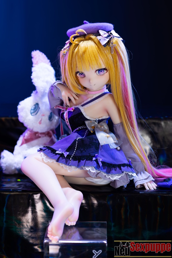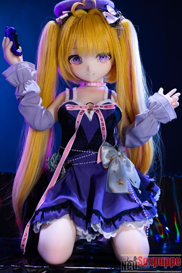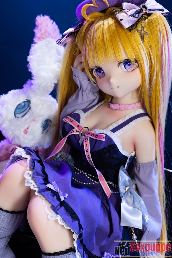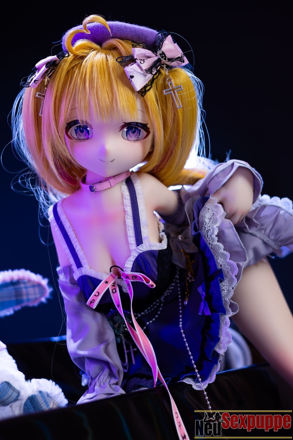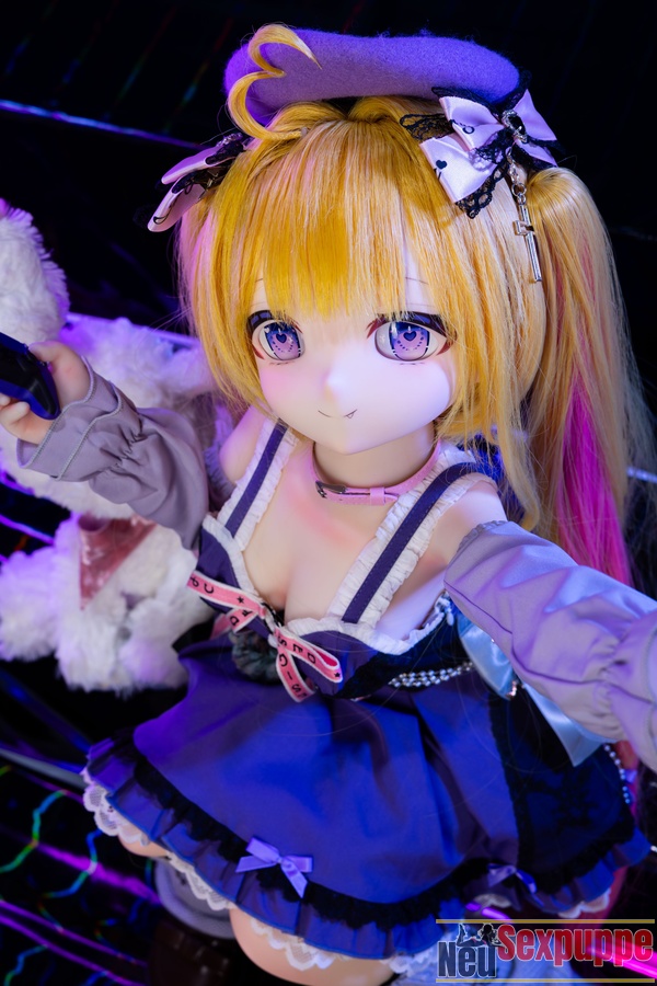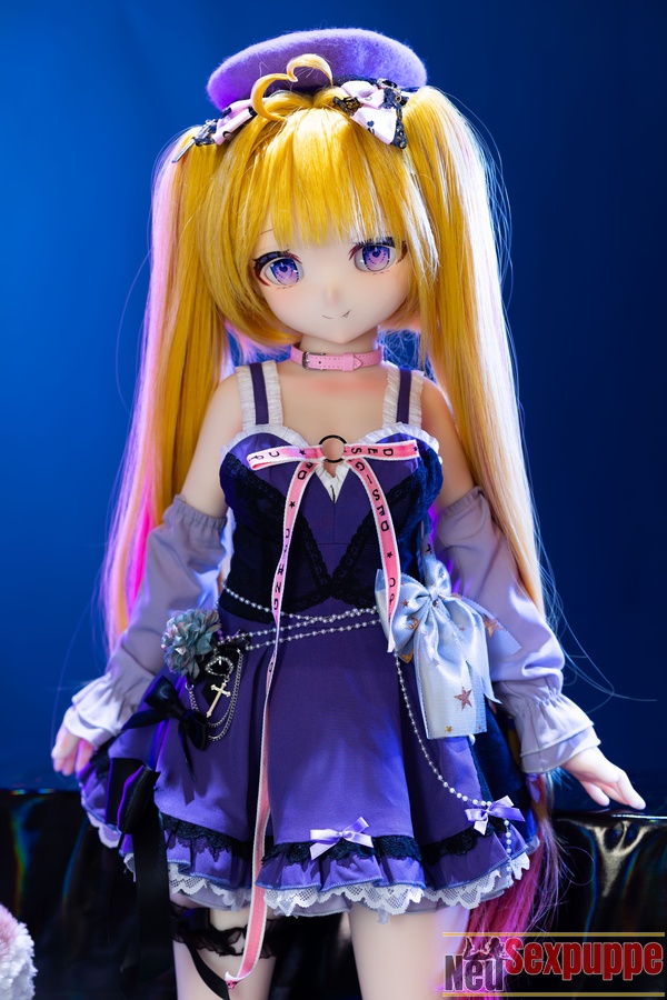 Das lange, goldene Haar wirkt im Licht besonders strahlend und harmoniert mit dem feinen Gesicht und den klaren Augen, wodurch eine Ausstrahlung entsteht, die zugleich niedlich und charmant wirkt. Der Gesichtsausdruck dieser Manga Sexpuppe wirkt leicht verspielt und selbstbewusst und vermittelt ein Gefühl von Fröhlichkeit und Freiheit. Das Outfit ist im leichten Anime-Stil gestaltet und die Farbgebung ist überwiegend in Lilatönen gehalten.