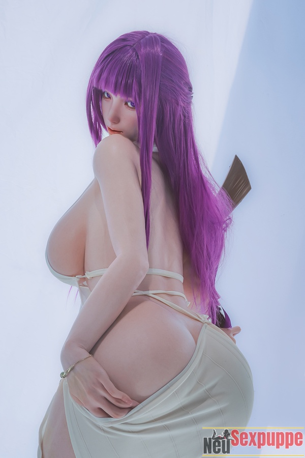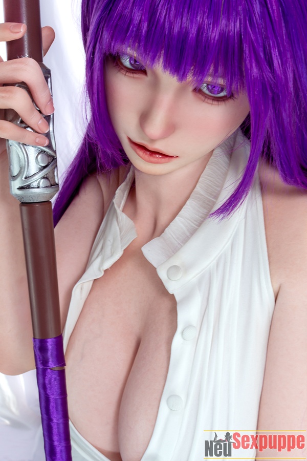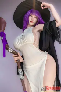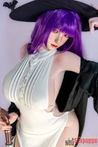 Diese Cosplay Sexdoll verkörpert die Figur einer Hexe auf perfekte Weise. Das lange violette Haar bildet zusammen mit dem schwarzen Hexenhut einen markanten Kontrast, während die violetten Pupillen verführerisch und geheimnisvoll wirken – ein Blick auf sie entführt Sie sofort in eine mystische Welt voller Magie.